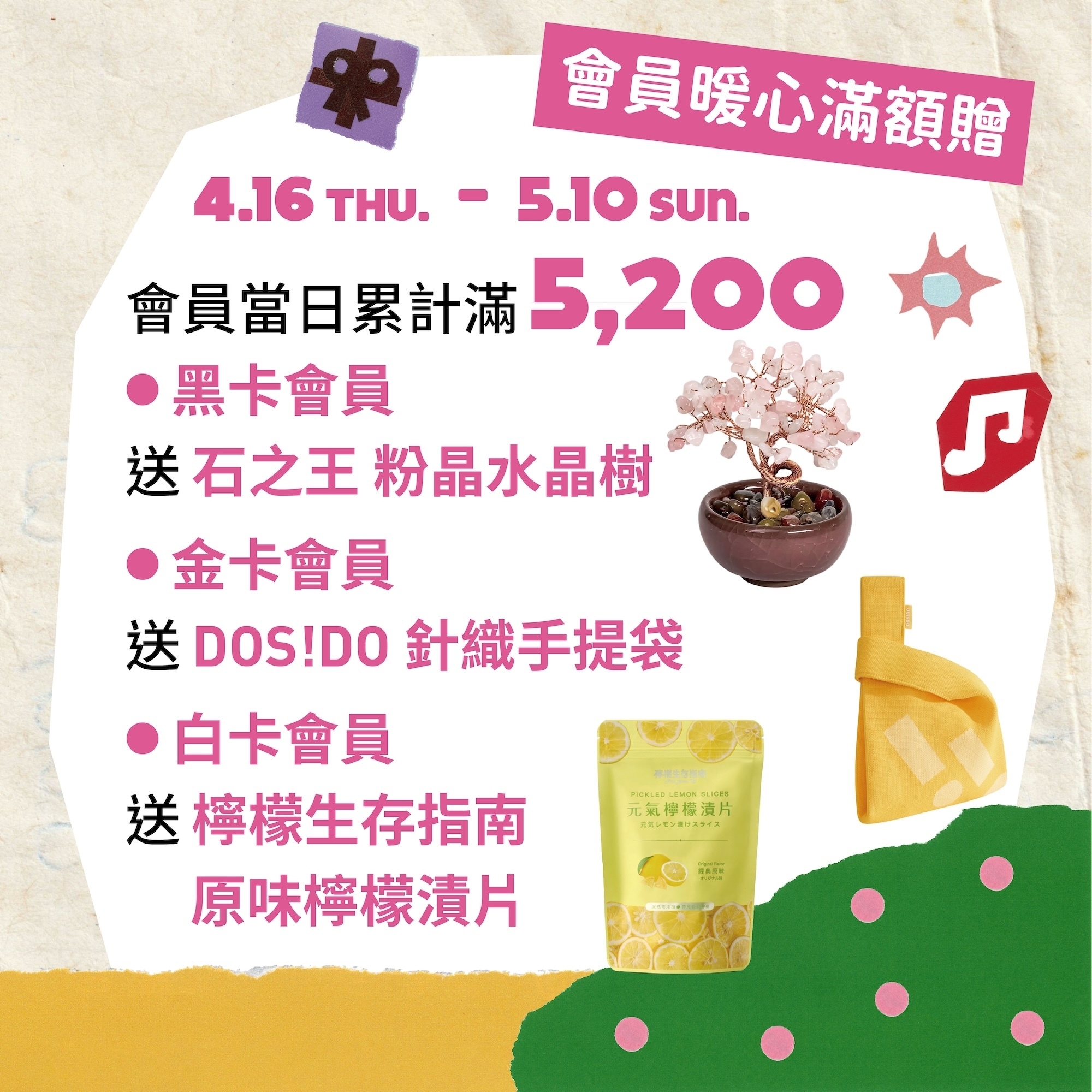 卡別暖心滿額贈,粉晶水晶樹、針織手提袋或檸檬漬片等你拿!