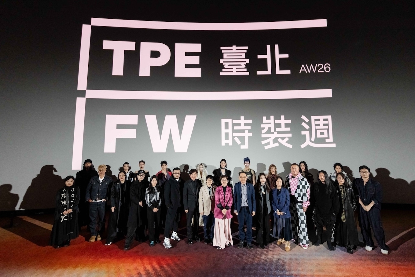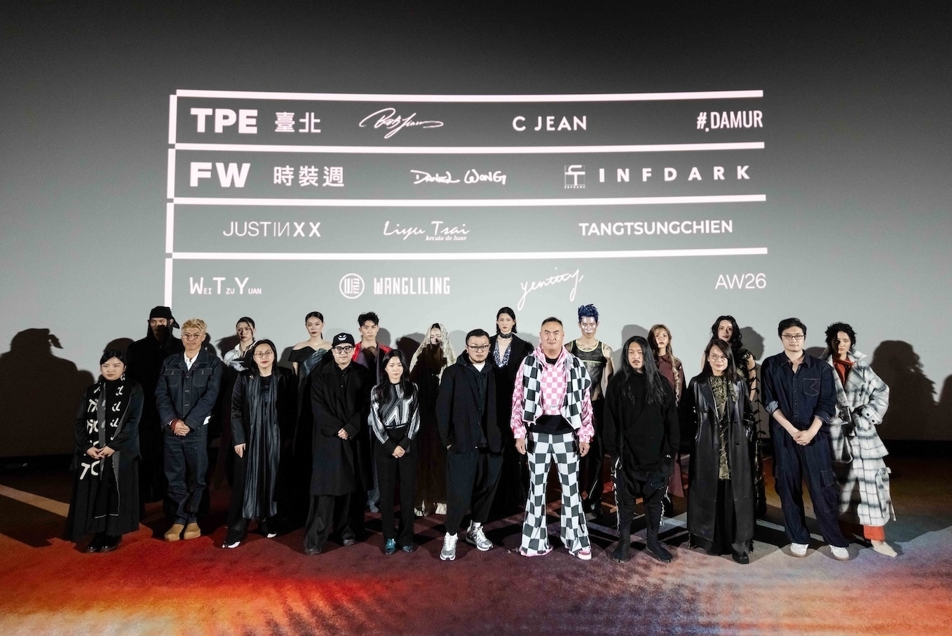 「臺北時裝週AW26」將於3月26日至29日登場,品牌設計師、代表與模特兒合影(前排左起TANGTSUNGCHIEN、Daniel Wong、WANGLILING 、WEITZUYUAN、C JEAN 、BOB Jian、#DAMUR 、INFDARK 、Liyu Tsai 、Yentity)。